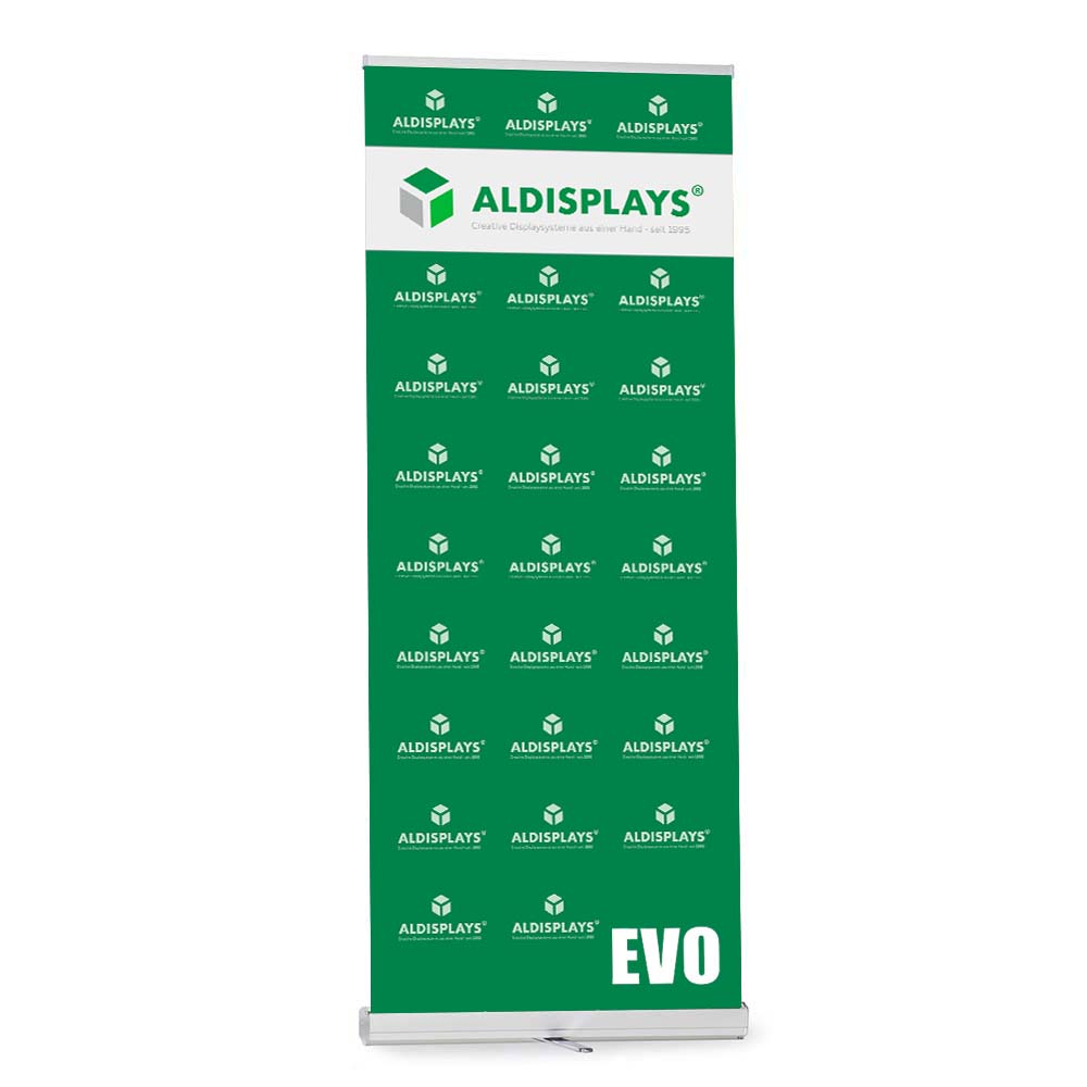 Bannerdisplay RollUp - EVO100 - Sichtformat: 1.000 x 2.200 mm - Verchromte Seiten und Standfuß, Teleskopstange, - gepolsterte Transporttasche mit Tragegurt, - Digitaldruck 1000 x 2360 mm (Greyback PVC-frei B1) - Druck gem. gel. Druckdaten - einzeln verpackt