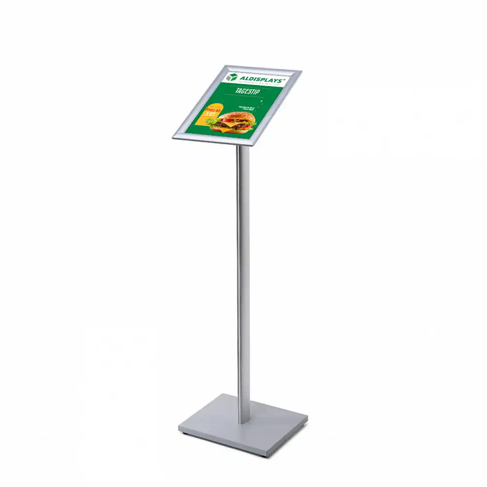 Infoständer mit Klapprahmen - im Format DIN A4 (hoch oder quer) - Klapprahmen im 25er Profil Gehrung - Farbe: silber-eloxiert (EV1) - Einlegeformat 297x210 mm - Stabile Aluminium-Konstruktion, Fuß Holz