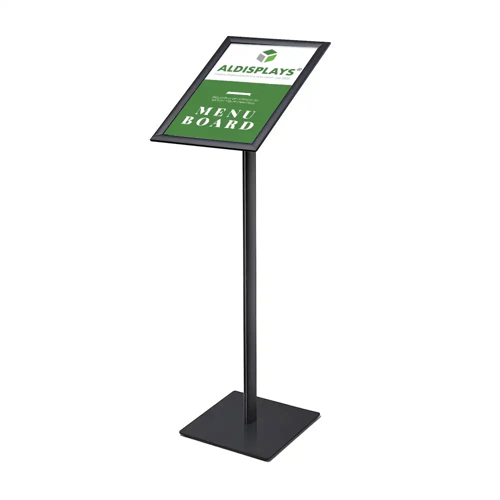 Infoständer mit Klapprahmen Schwarz - im Format DIN A3 (hoch oder quer) Klapprahmen im 25er Profil Gehrung - Farbe: Schwarz - Einlegeformat 420x297 mm - Stabile Aluminium-Konstruktion, Fuß Metall