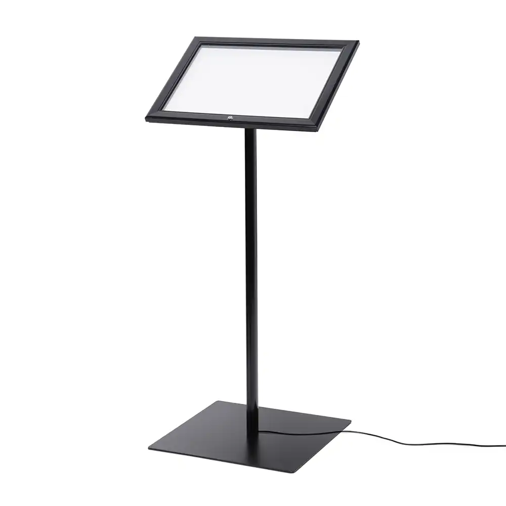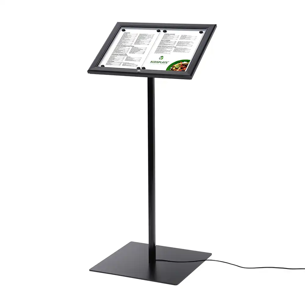 Menüständer 2x DIN A4 mit LED Beleuchtung - Einlegeformat: 2x1 DIN A4 - Menükasten u. Pfosten aus Alu, schwarz eloxiert - Fussplatte Stahl, schwarz lackiert - Rückwand: weiß, magnethaftend - abschließbar mit Zylinderschloss